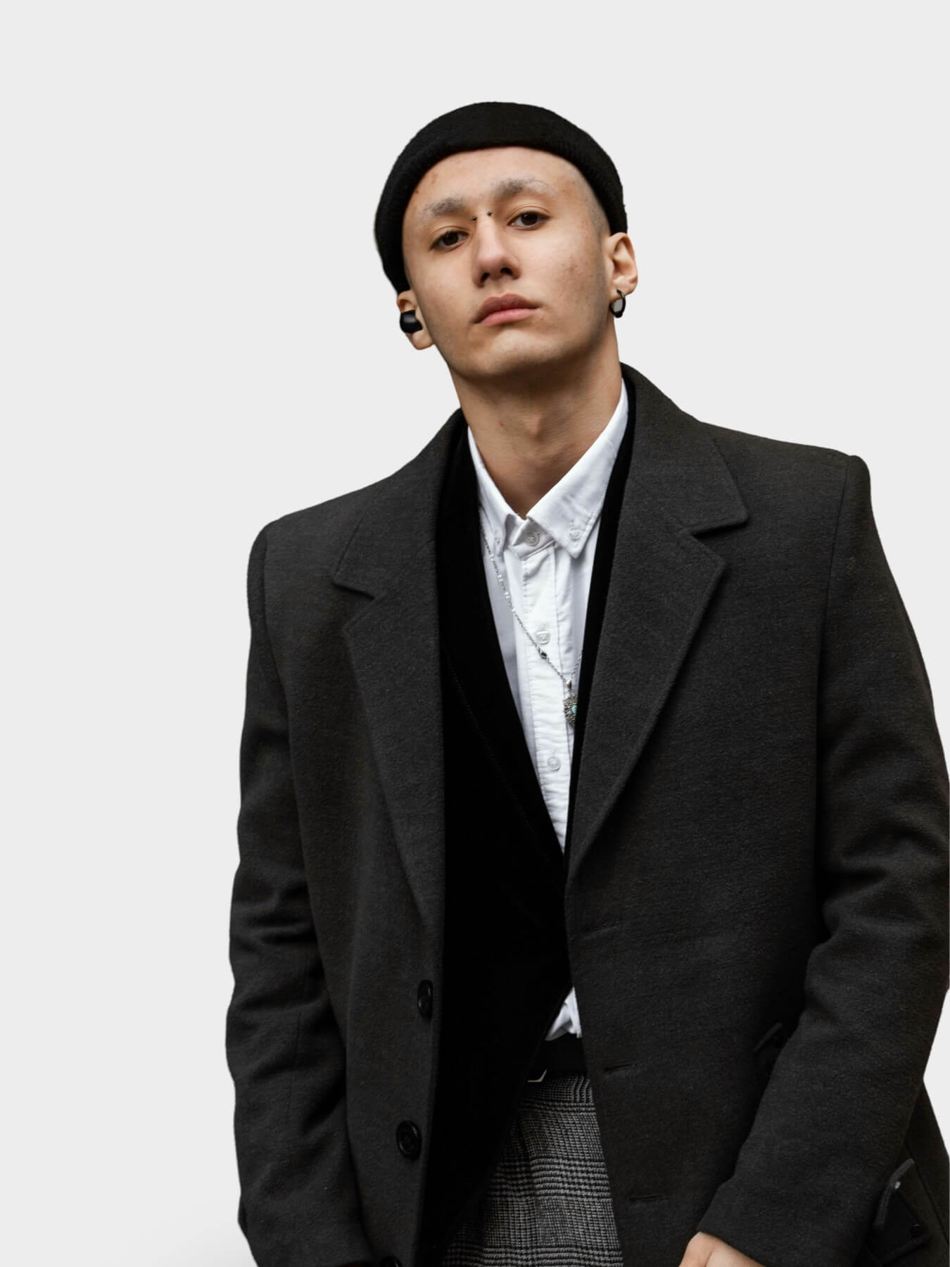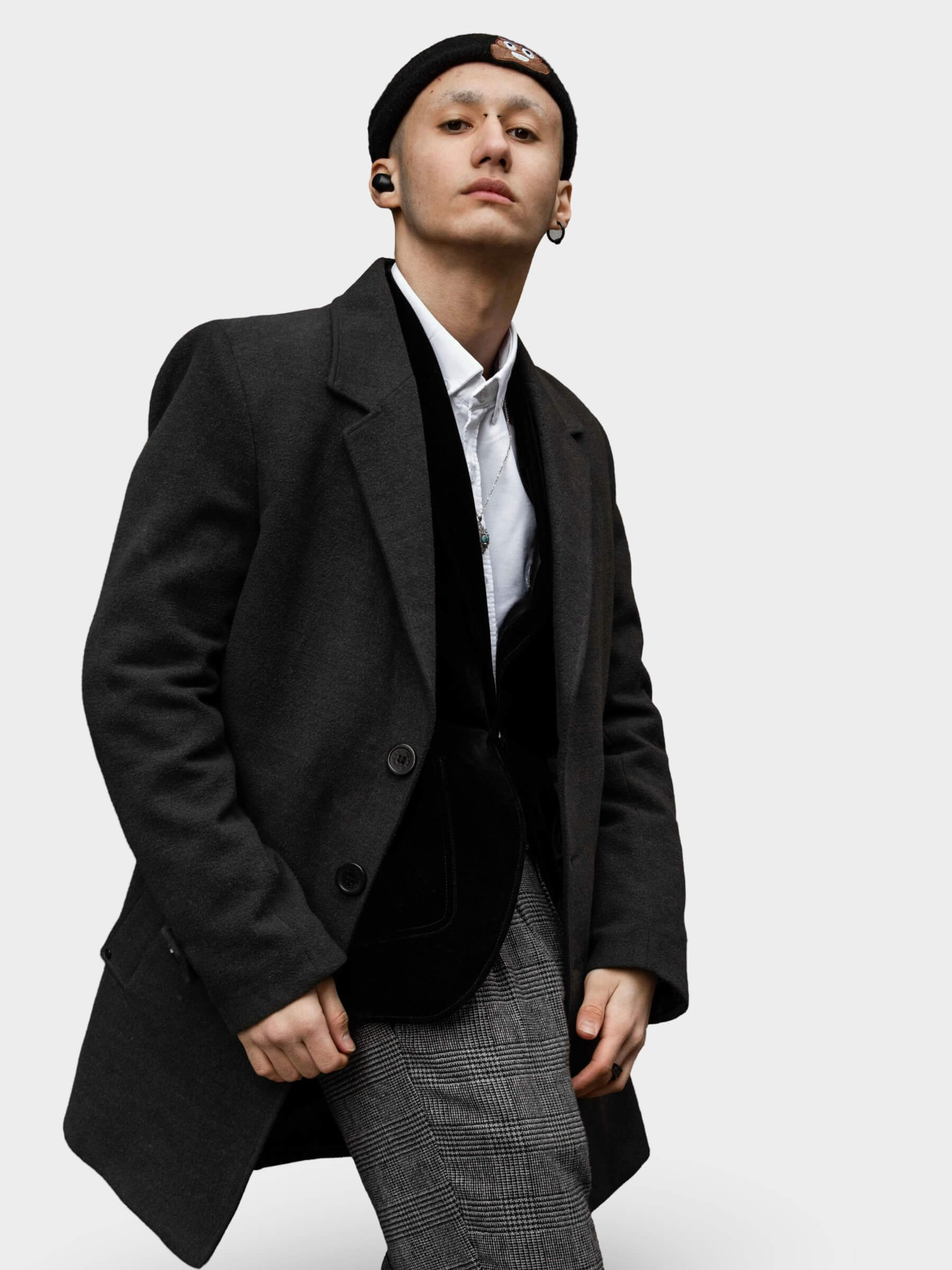 Shirt Collar. Removable hood. Button on the front. Two side pockets. Buttoned cuffs. Wool mix fabric. Button up. Inner pocket.