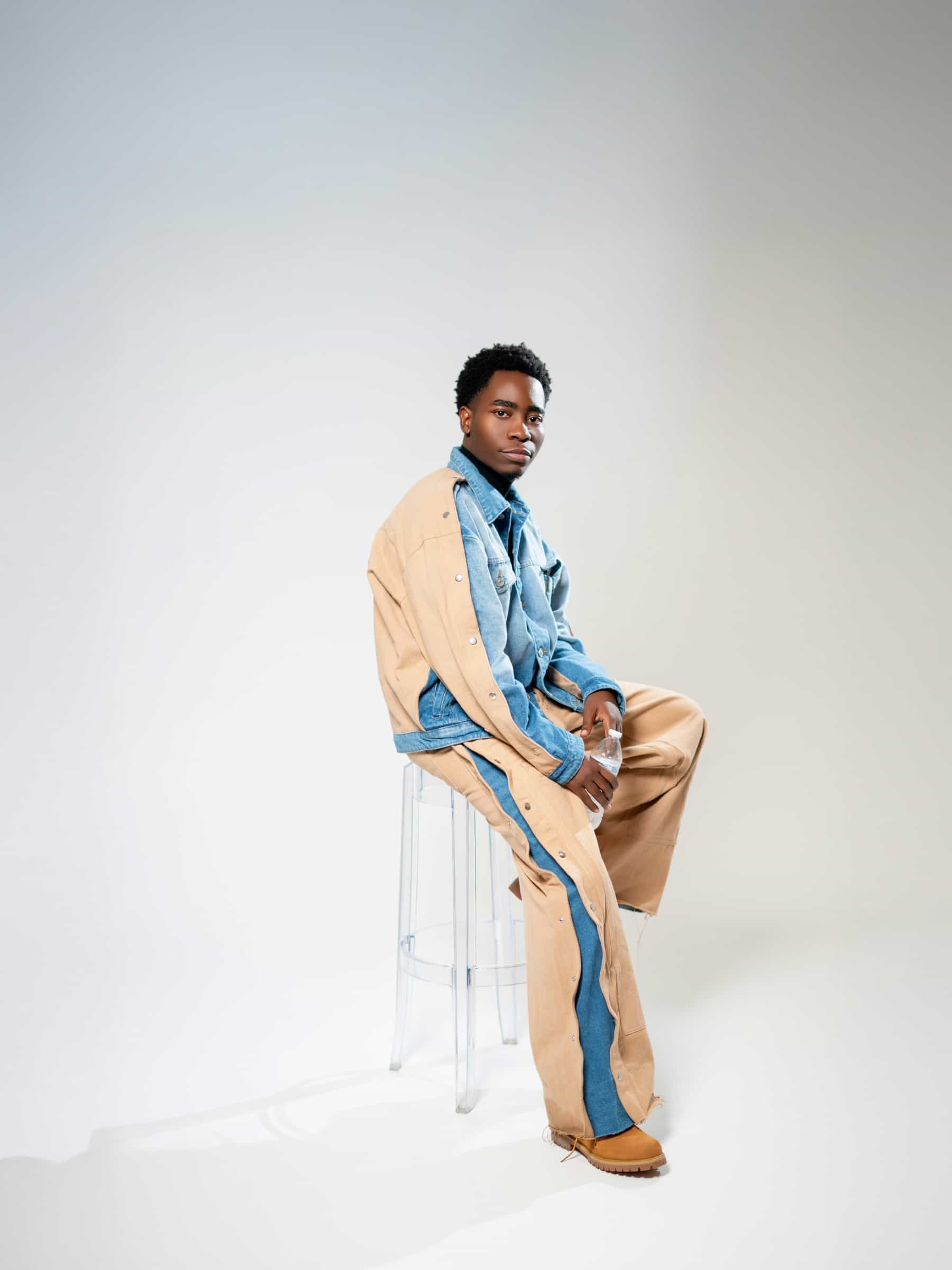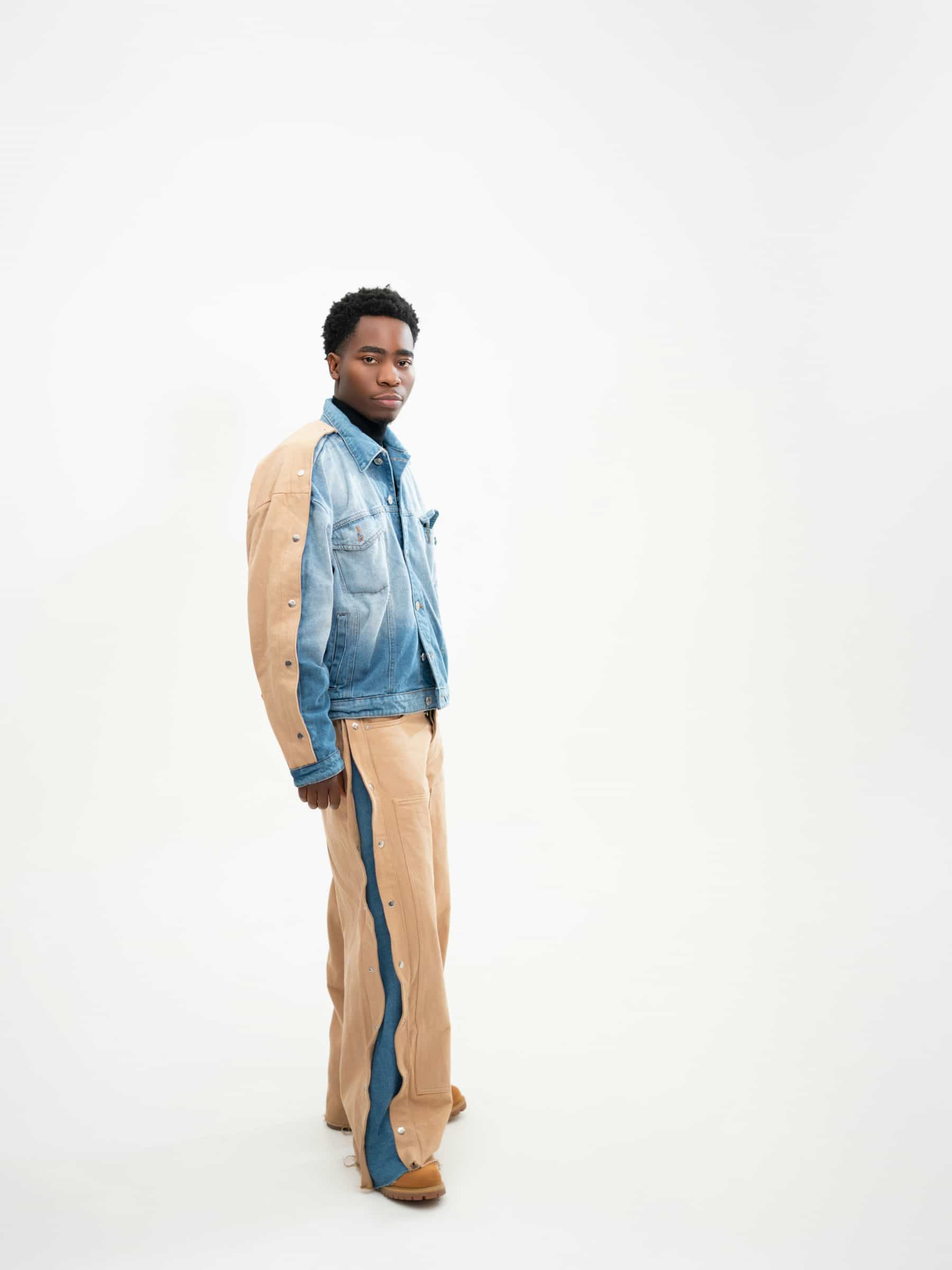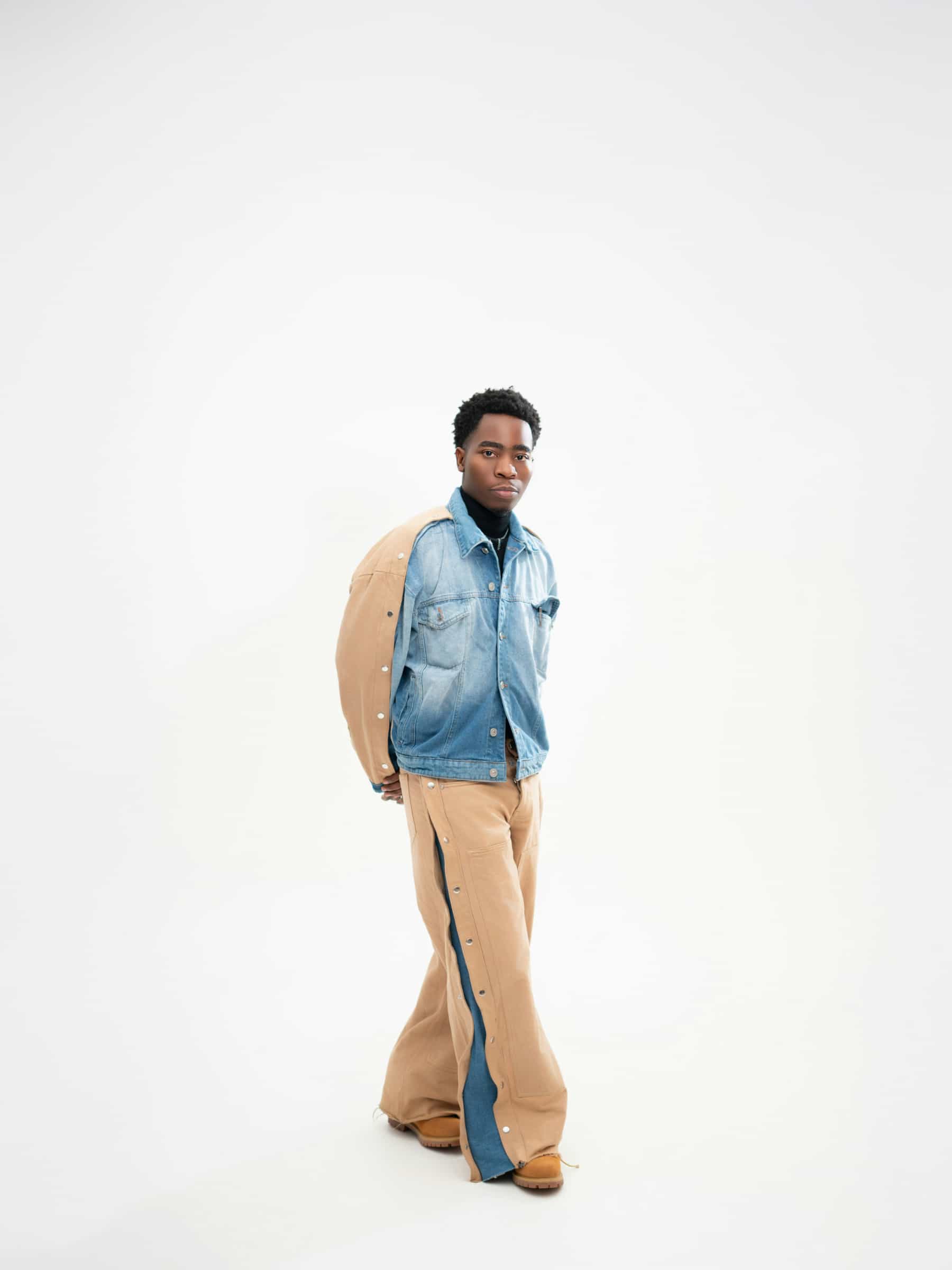 Wide denim jacket with rivets on the side.